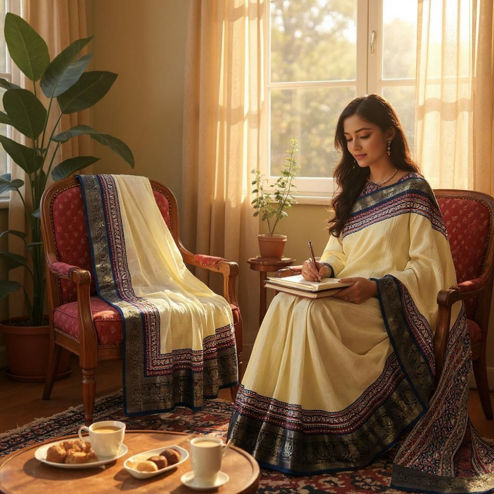• Cream Pure Dola Rico Silk Zari Weaved Blue Border Saree