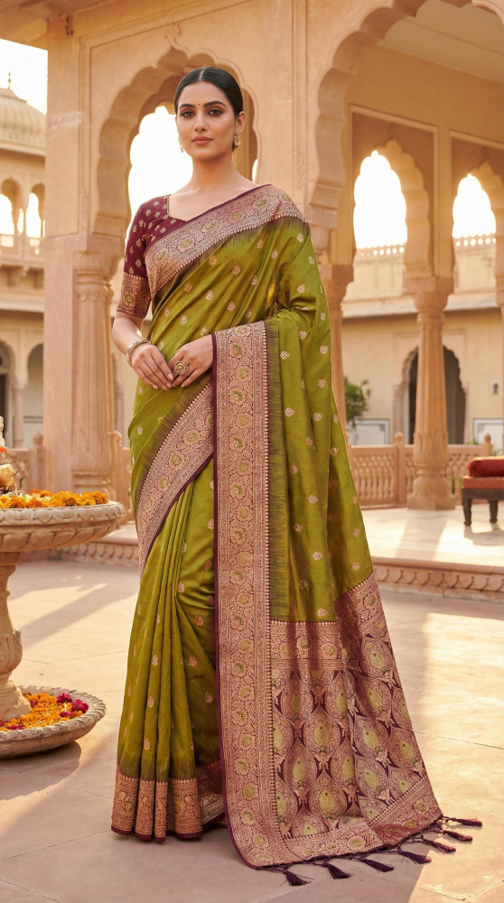 Mehendi Banarasi Silk Rich Zari Meenakari Weaved Saree